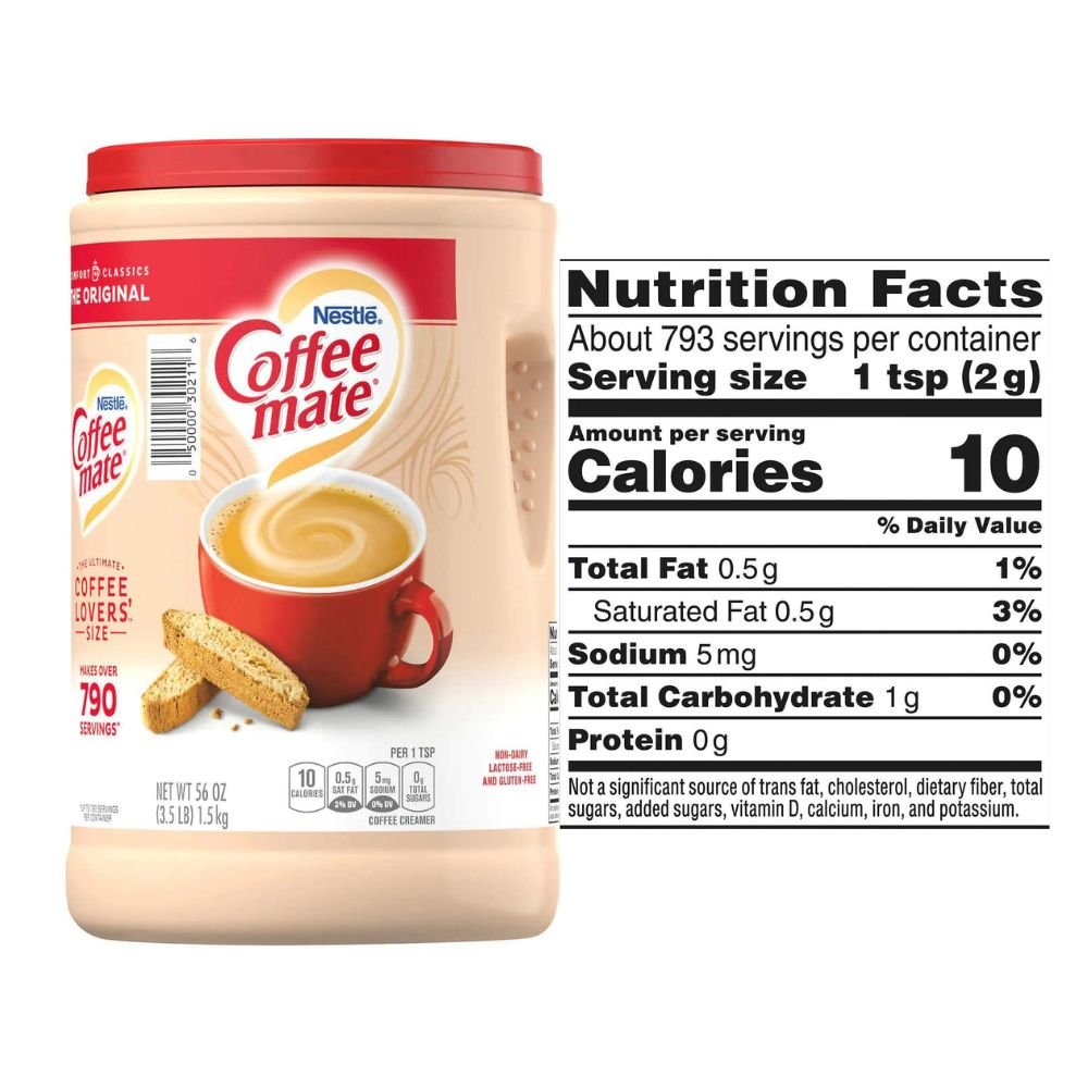 Nestle Coffee Mate Coffee Creamer is a non-dairy creamer that adds a rich and creamy taste to your coffee. It is made from high-quality ingredients and provides a convenient and easy way to enhance the flavor of your coffee.